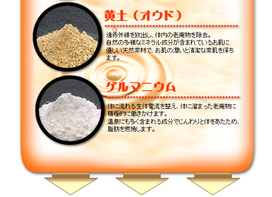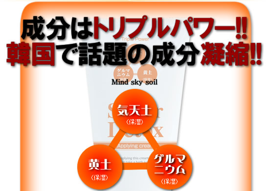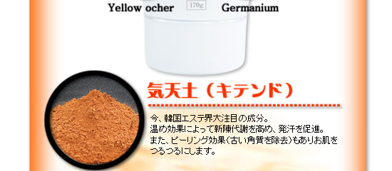 水、ベントナイト、カオリン、グリセリン、BG、ペンチレングリコール、イライト(気天土)、黄土、レパゲルマニウム、水溶性コラーゲン、スクワラン、アロエベラエキス、キュウリエキス、カッコンエキス、クロレラエキス、グリチルリチン酸2K、アラントイン、水酸化Na、黒酸化鉄、メチルパラベンN |